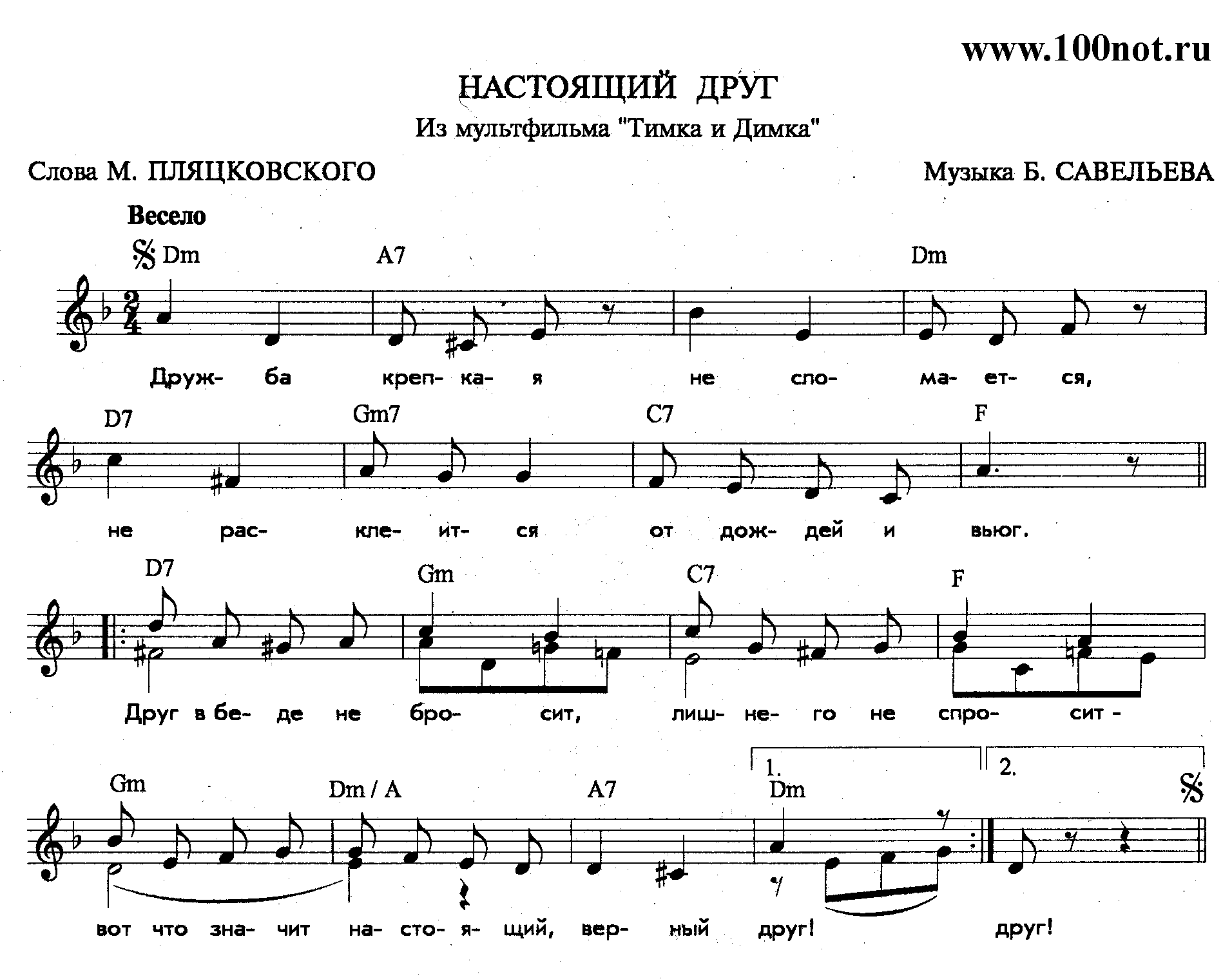 Дружба крепкая не сломается, Не расклеится от дождей и вьюг. Друг в беде не бросит, лишнего не спросит — Вот что значит настоящий, верный друг! (2 раза)