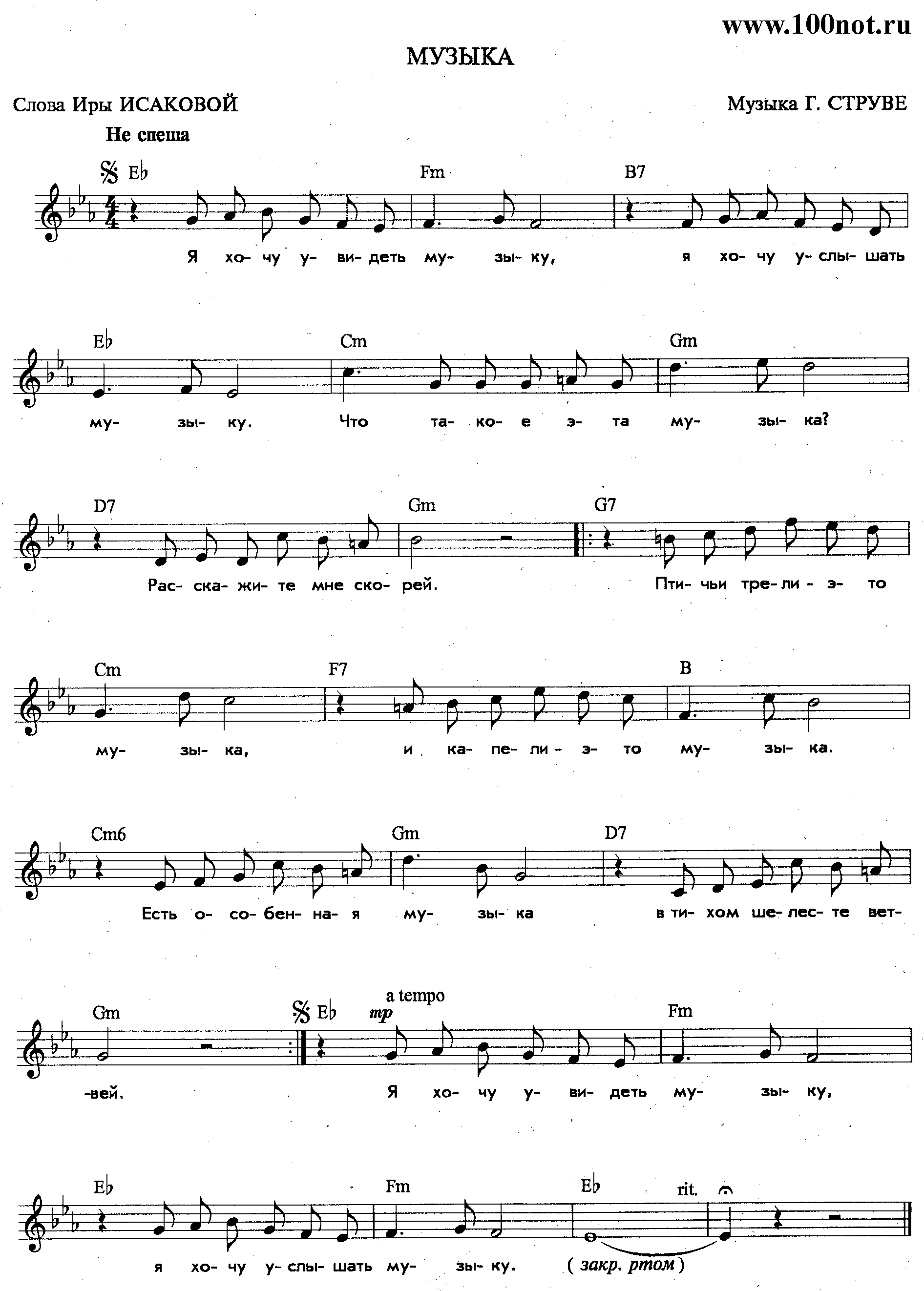 Я хочу увидеть музыку, Я хочу услышать музыку. Что такое эта музыка? Расскажите мне скорей. Птичьи трели — это музыка, И капели — это музыка. Есть особенная музыка В тихом шелесте ветвей.