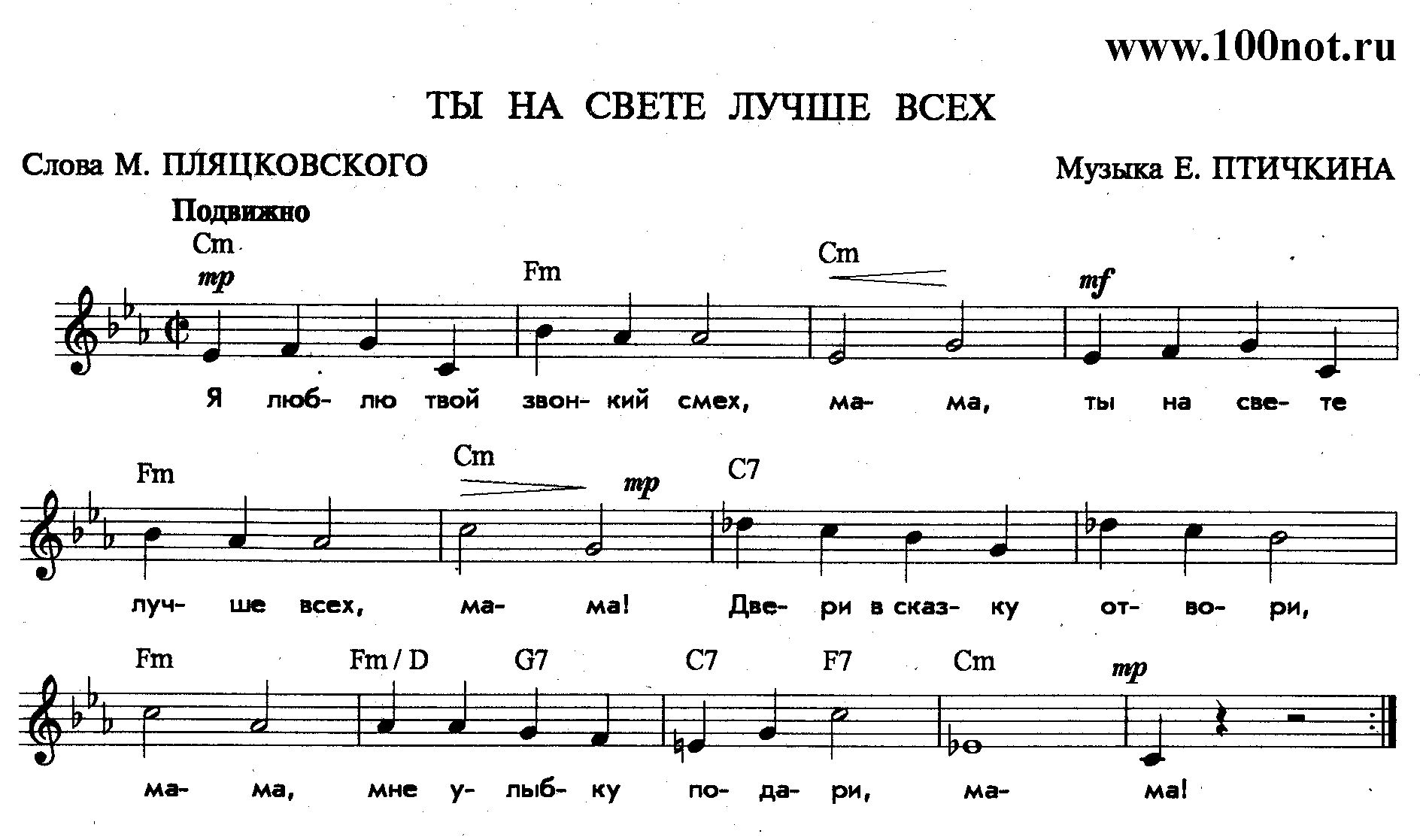 Я люблю твой звонкий смех, Мама, Ты на свете лучше всех, Мама! Двери в сказку отвори, Мама, Мне улыбку подари, Мама!
