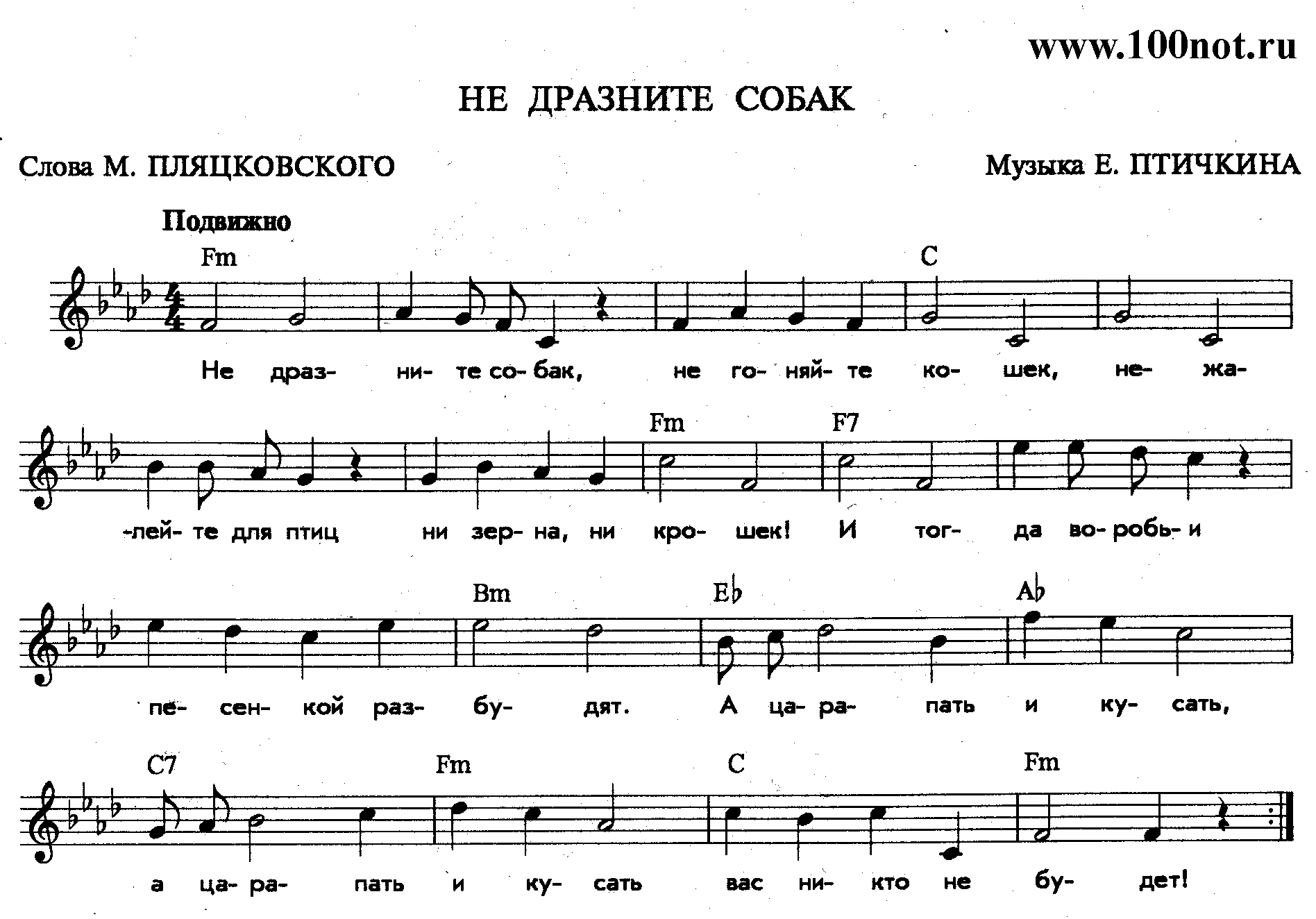 Не дразните собак, Не гоняйте кошек, Не жалейте для птиц Ни зерна, ни крошек! И тогда воробьи Песенкой разбудят. А царапать и кусать (2 раза) Вас никто не будет.
