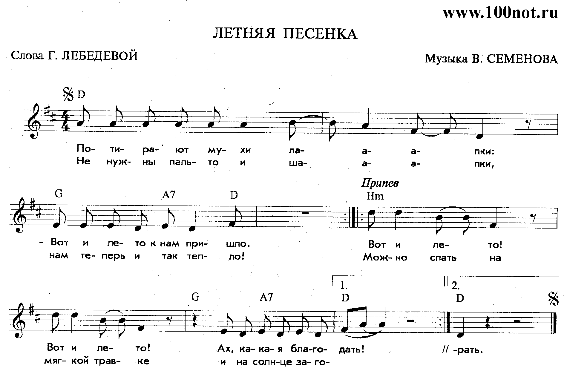 Припев: Вот и лето! Вот и лето! Ах, какая благодать! Можно спать на мягкой травке И на солнце загорать.