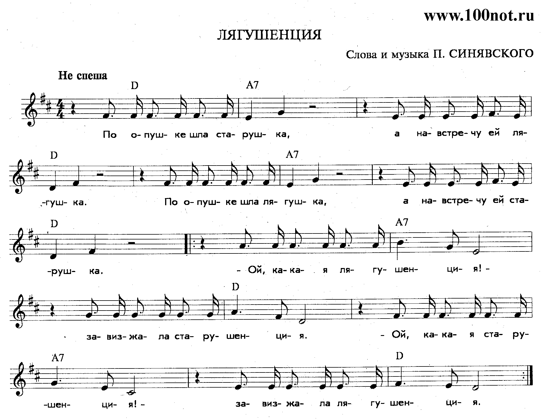 Но никто из лягушенций Не боится старушенций, И никто из старушенций Не боится лягушенций. Ведь лягушки не кусаются, На старушек не бросаются. И старушки не кусаются, На лягушек не бросаются.