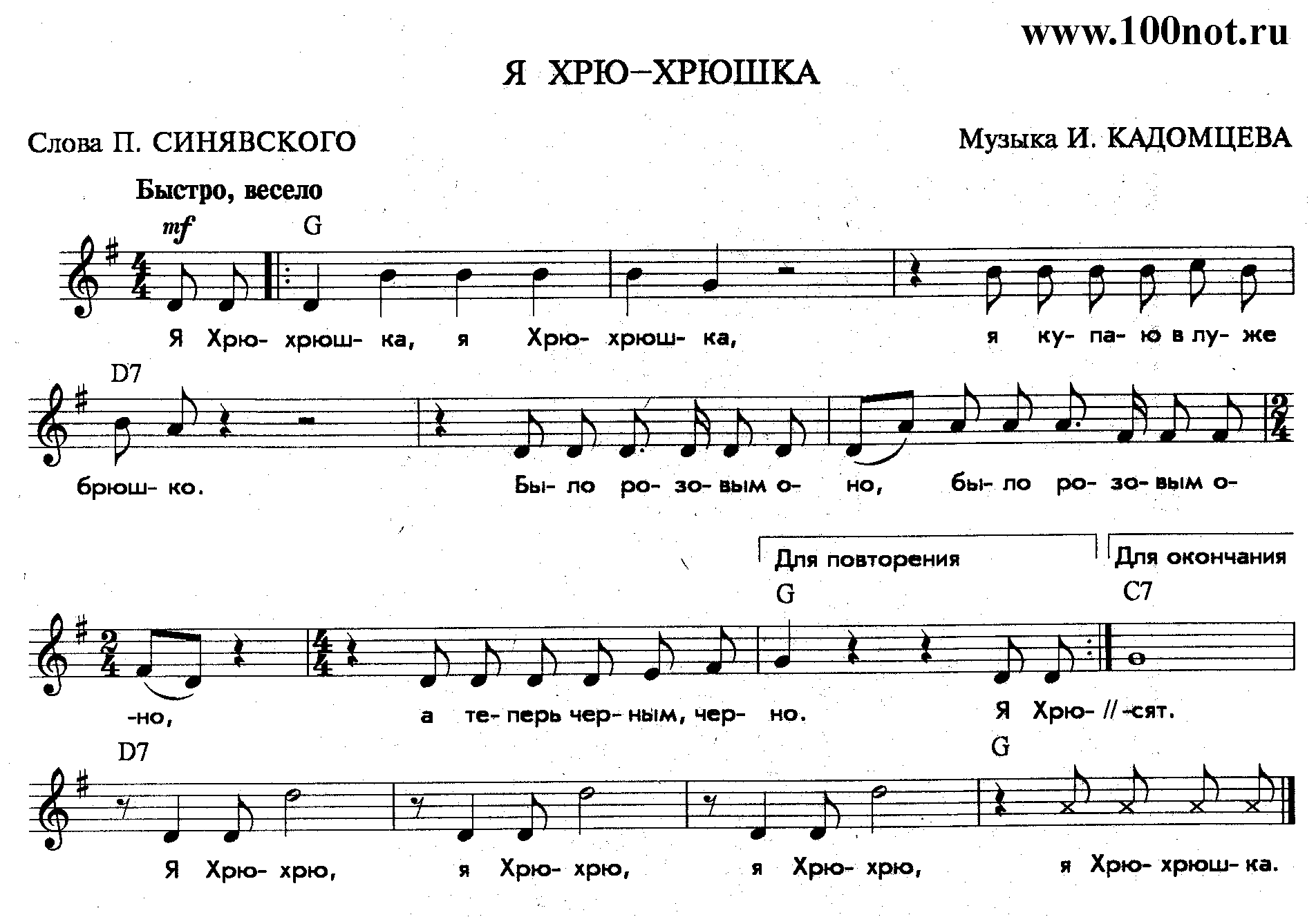 Я Хрю-хрюшка, я Хрю-хрюшка, Я купаю в луже брюшко. Было розовым оно, А теперь черным-черно. (2 раза)