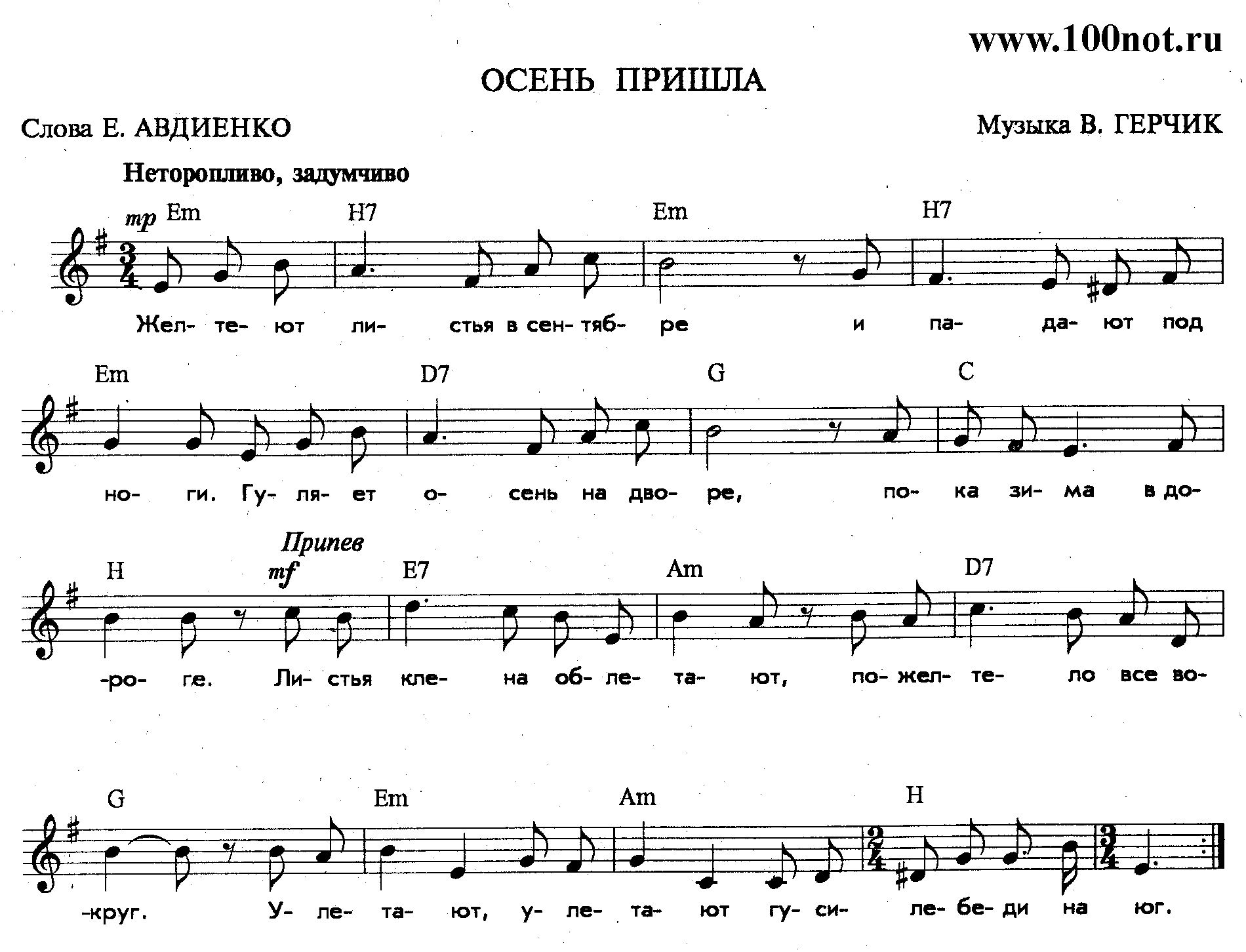 Припев: Листья клена облетают, Пожелтело все вокруг. Улетают, улетают Гуси-лебеди на юг.