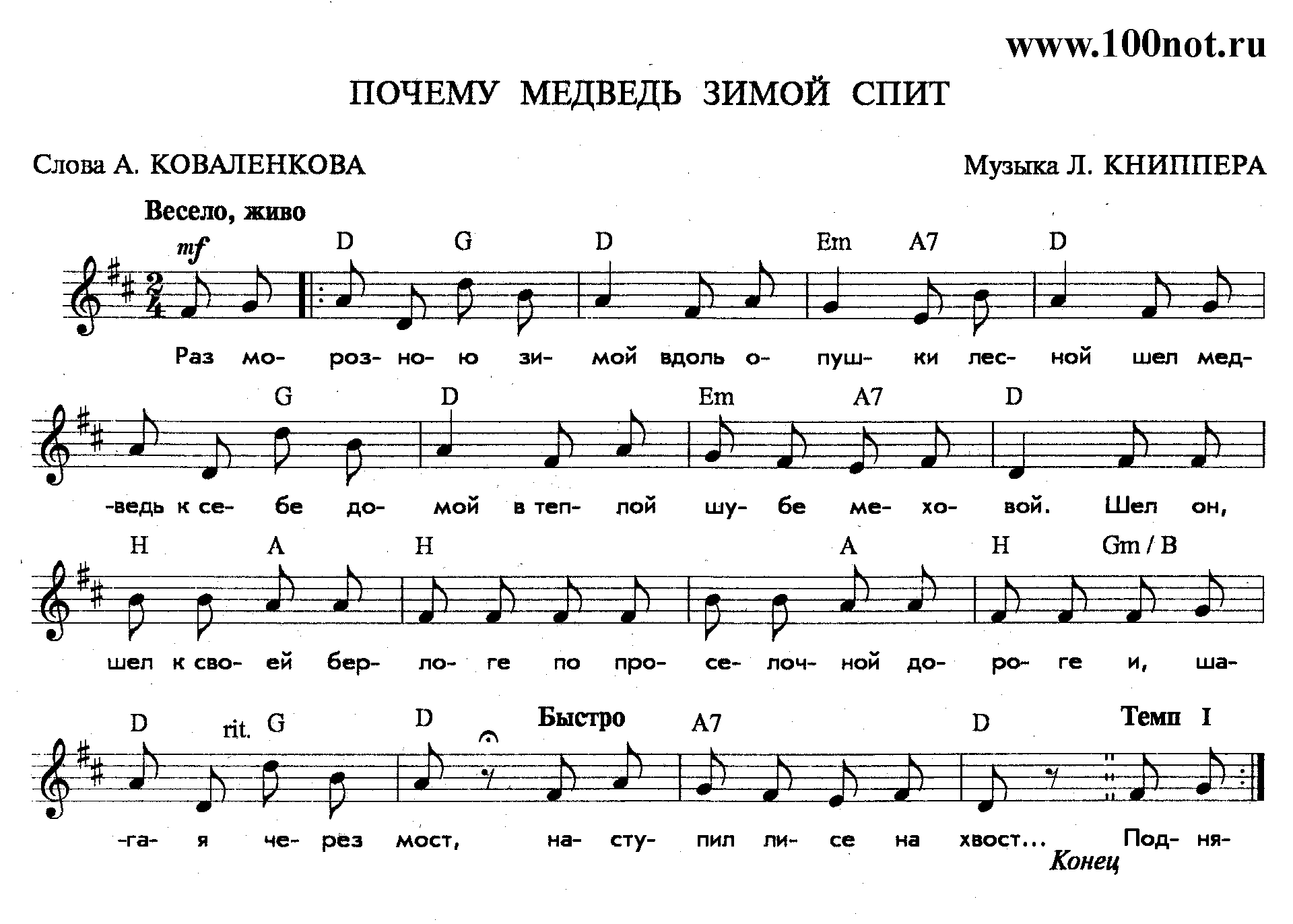 Раз морозною зимой Вдоль опушки лесной Шел медведь к себе домой В теплой шубе меховой. Шел он, шел к своей берлоге По проселочной дороге И, шагая через мост, Наступил лисе на хвост...