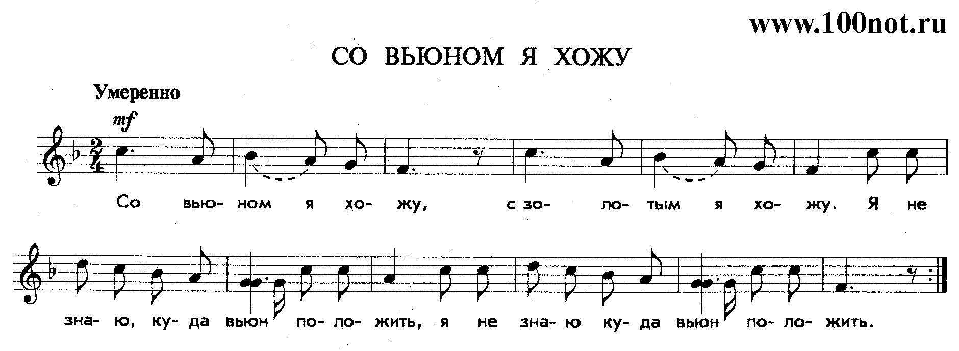 Со вьюном я хожу, С золотым я хожу. Я не знаю, куда вьюн положить, Я не знаю, куда вьюн положить.